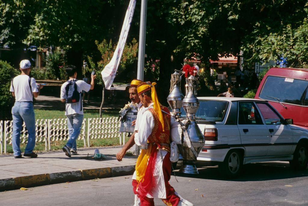 Am nächsten Morgen frühstücken wir in einem Straßencafé, trinken türkischen Apfel- und Schwarztee und beobachten das bunte Treiben auf der Straße. Männer mit bunten Kleidern und einem Fez auf dem Kopf tragen riesige Wasserkannen auf dem Rücken und Becher und Tee im Bauchladen - "Tea to go" auf türkisch.